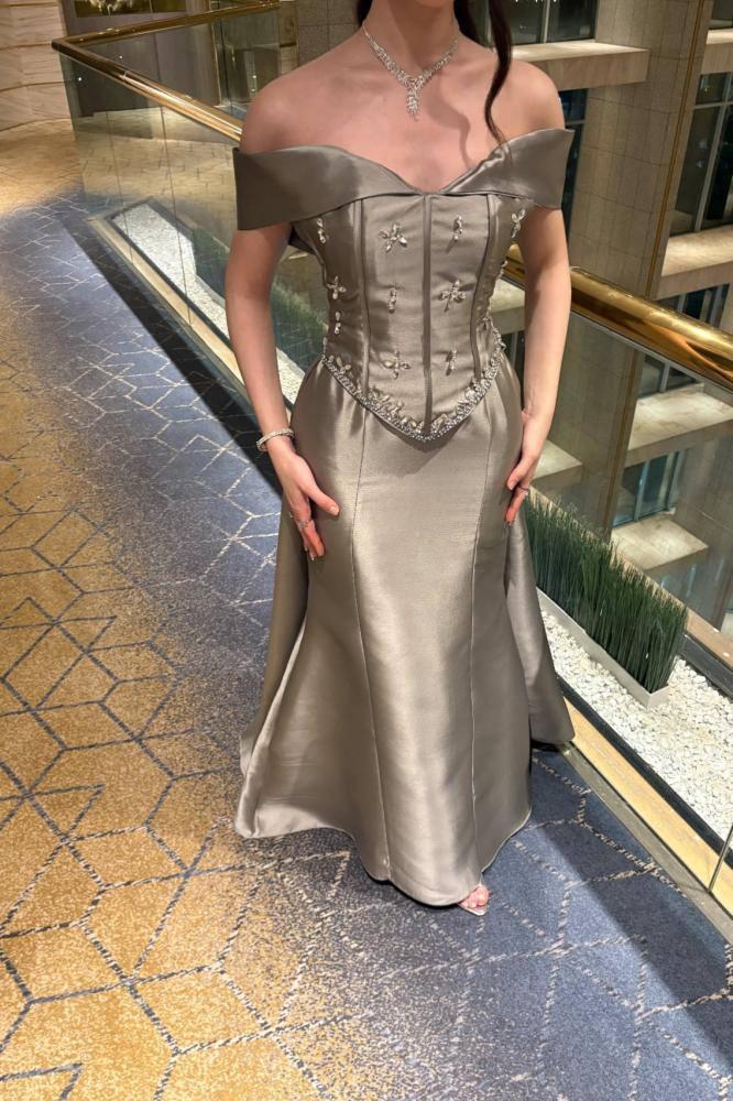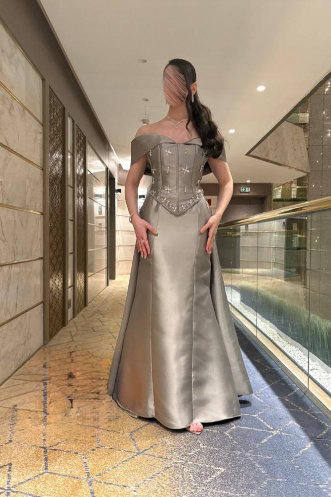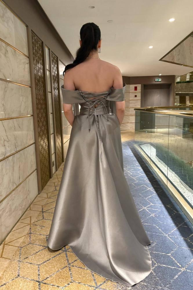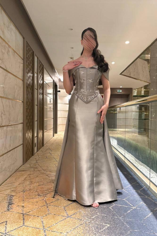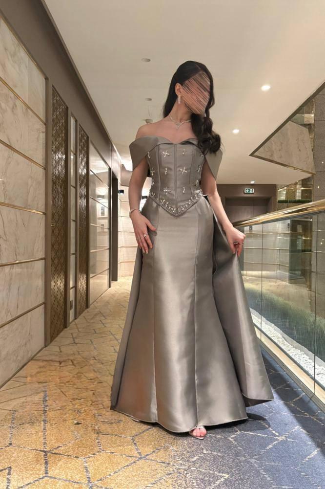 فستان سهرة رمادي بتصميم اوف شولدر أنيق يبرز جمال الاكتاف مع كورسيه مطرز يضيف لمسة فخمة يتميز بخيوط خلفية تبرز القوام وتشد الخصر وقصة سفلية فاخرة بذيل يمنح الإطلالة حضورًا فخمًا